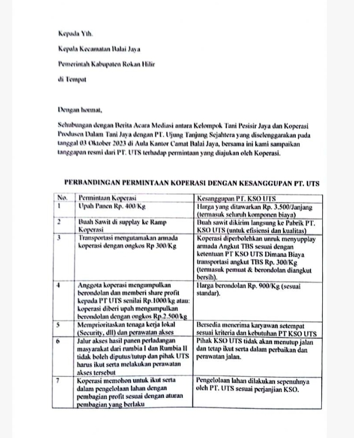 Berikut poin jawaban PT UTS melalui surat dan dikirim ke Camat Balai Jaya, yaitu, harga yang ditawarkan Rp3.500 perkilo perjanjang (termasuk seluruh komponen biaya), Buah sawit dikirim langsung ke Pabrik PT KSO UTS (untuk efisiensi dan kualitas)